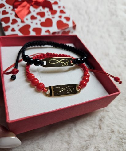 Set de 2 bratari impletite cu margele si placuta gravata cu semnul infinit si initiale la alegere BPC337
