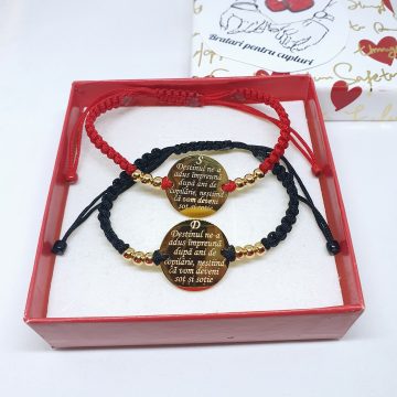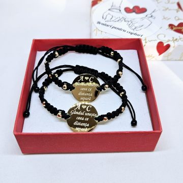 Set de 2 bratari cu mesajul ”Gandul/iubirea uneste ceea ce distanta separa” si initiale la alegere.