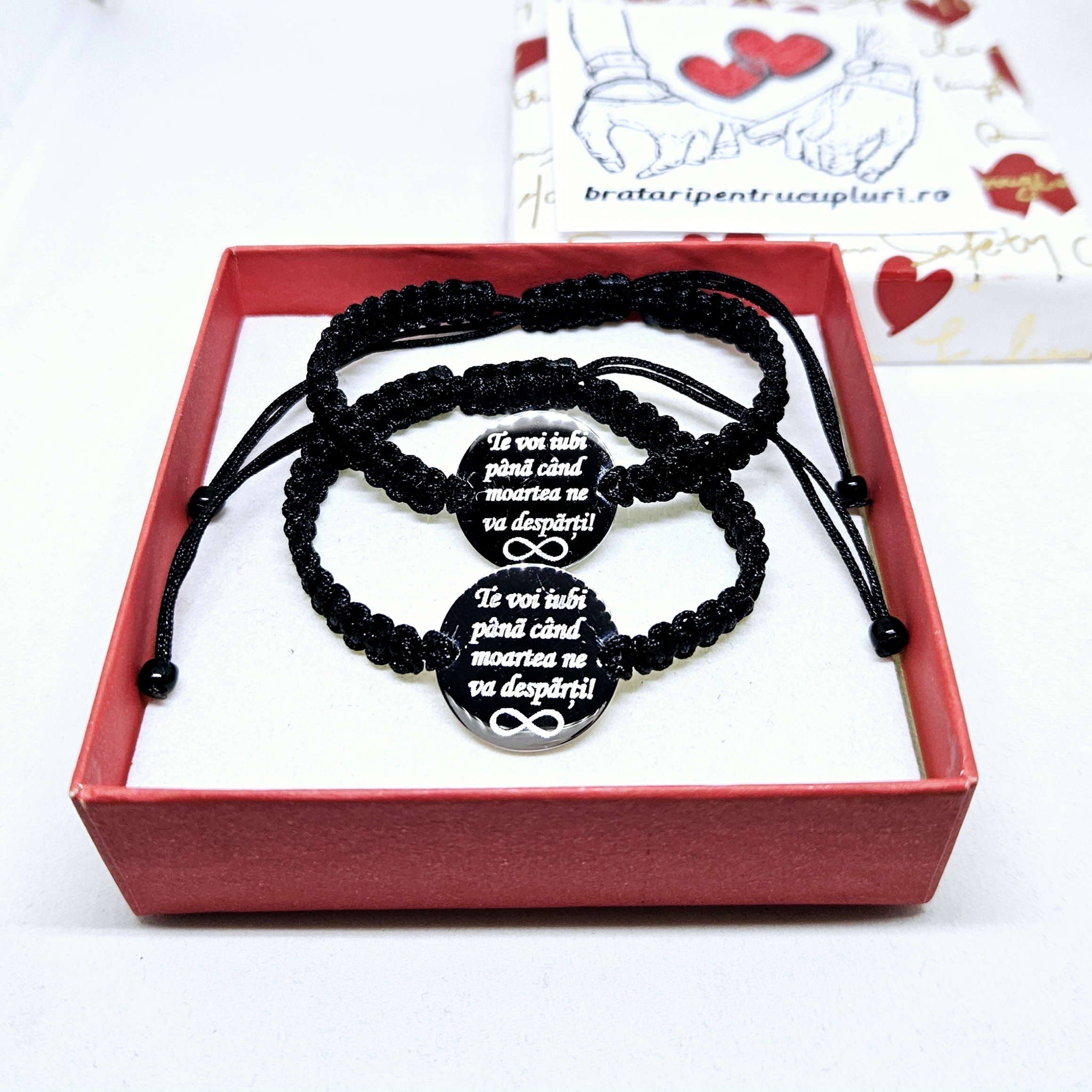 (completati rubricile de personalizare a ambelor bratari (pentru femeie si pentru barbat) cu ce doriti sa fie gravat pe ele, puteti modifica culoarea snurului in : rosu, negru sau crem).