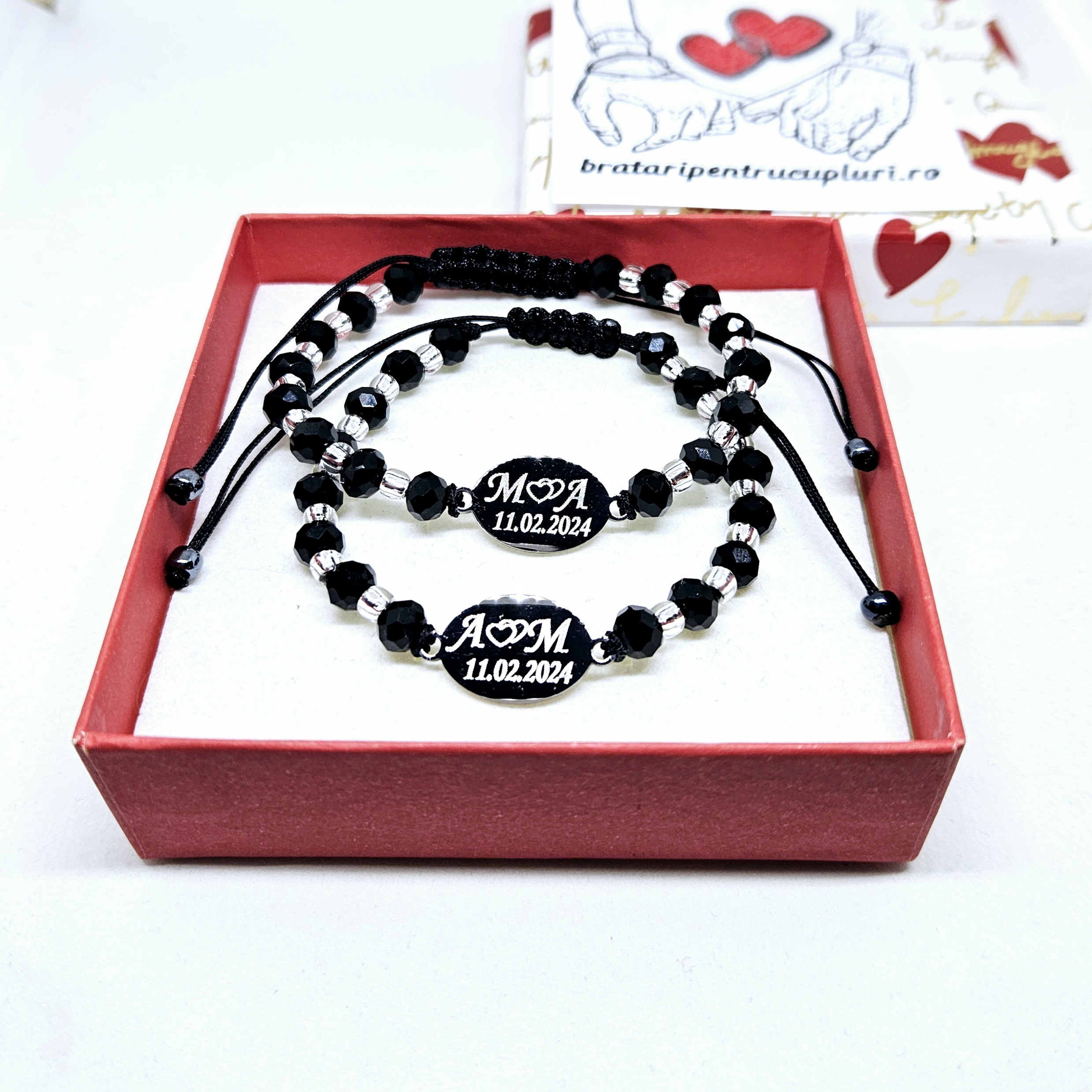 Set de 2 bratari cu margele fatetate cu initiale si data la alegere.