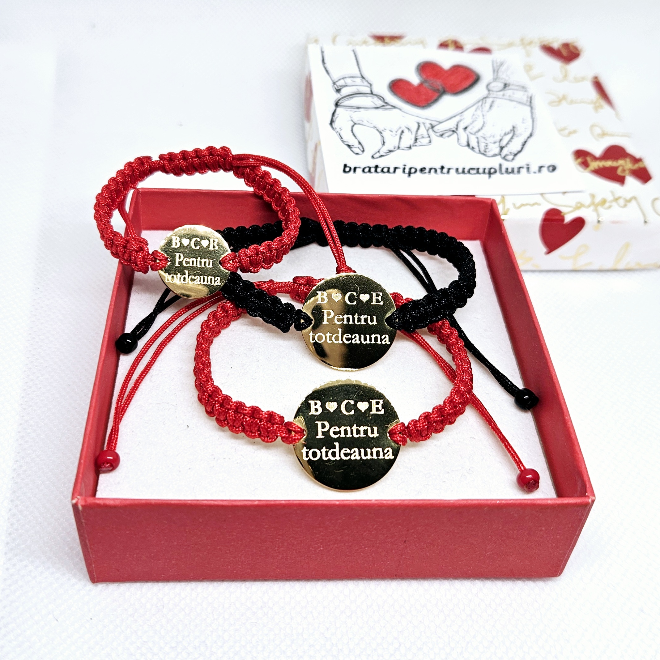 (completati rubricile de personalizare a ambelor bratari (pentru femeie si pentru barbat) cu ce doriti sa fie gravat pe ele, puteti modifica culoarea snurului in : rosu, negru sau crem).